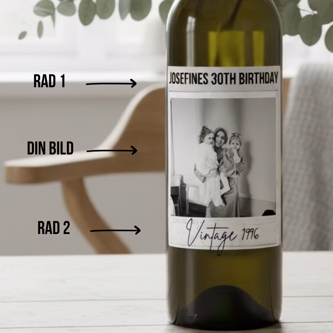 Skapa en tidlös och personlig gåva genom att designa din egen flasketikett i vintage stil till vin- eller bubbelflaskor. Med våra personliga flasketiketter i retrodesign laddar du enkelt upp ett eget foto och kombinerar det med en valfri text – perfekt för dig som vill ha en klassisk och elegant känsla.