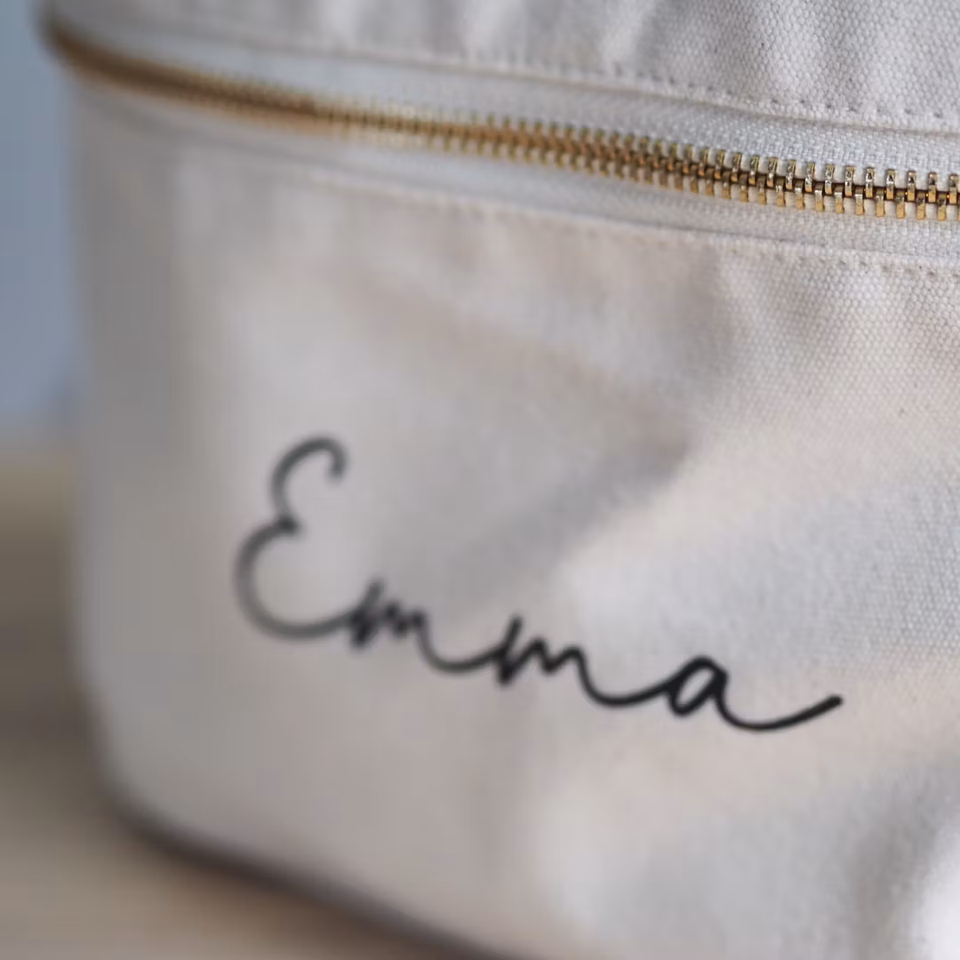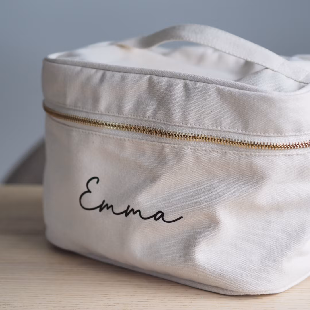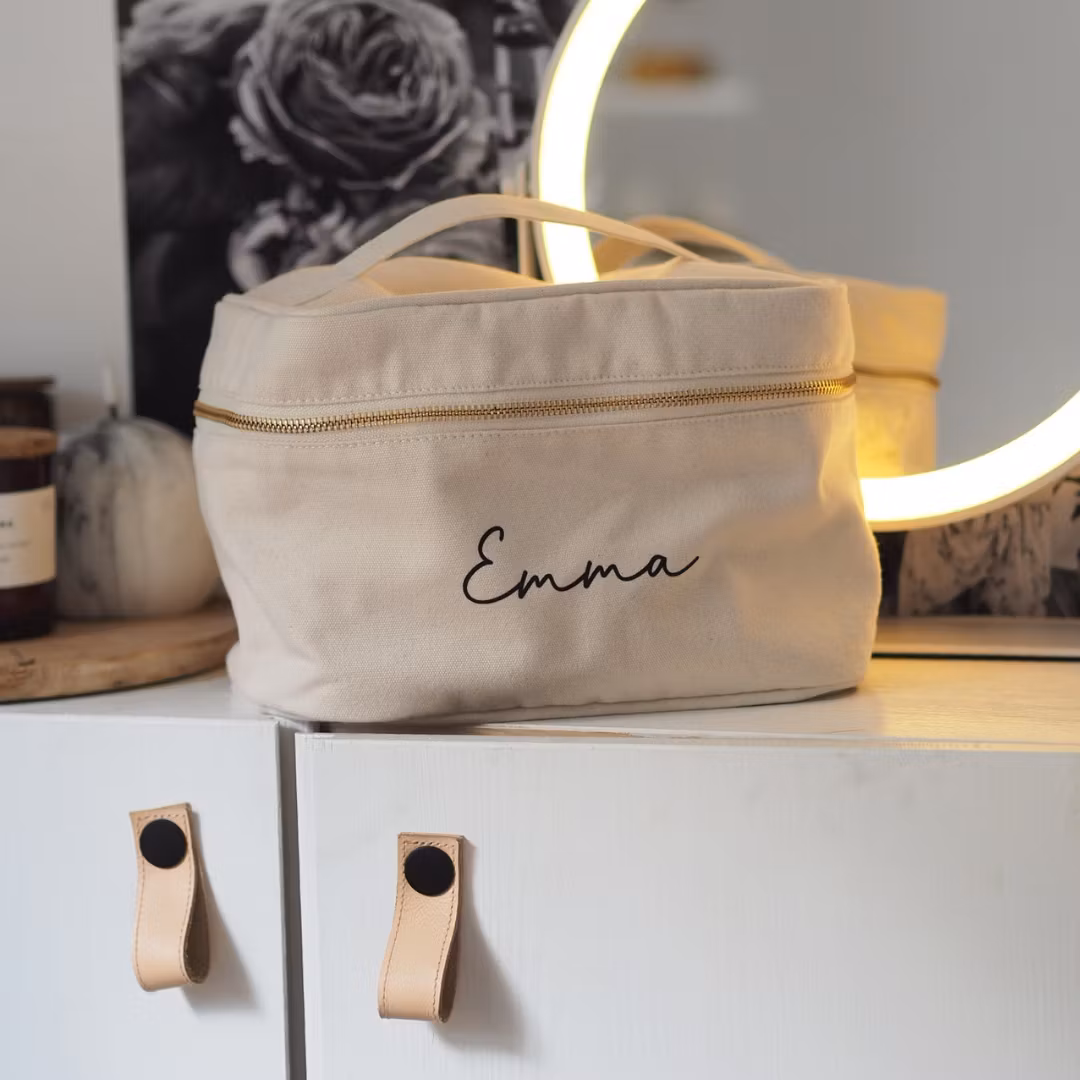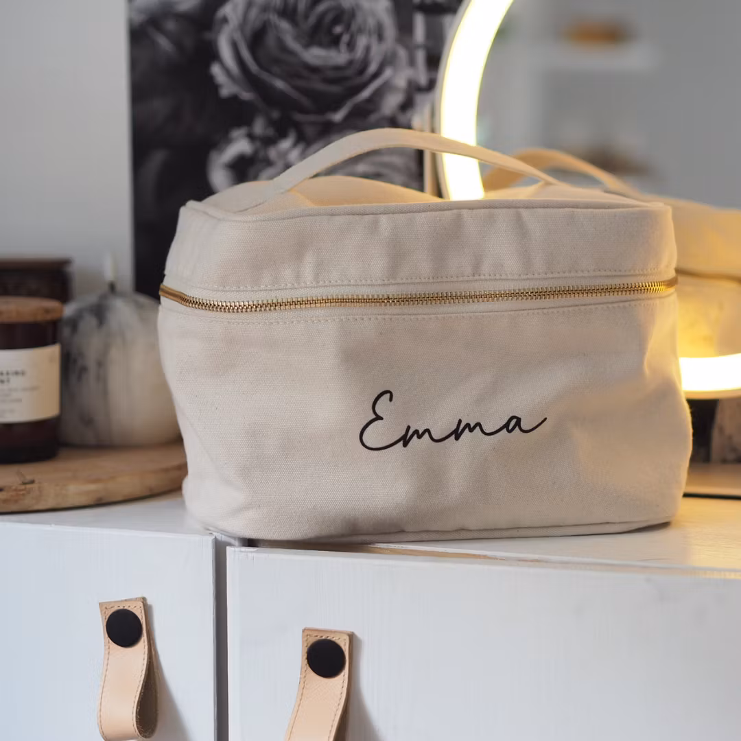 Håll ordning på dina skönhetsfavoriter med stil! Denna personliga sminkväska är tillverkad i 100% bomull och kan anpassas med ditt eget namn – perfekt som present till dig själv eller någon du tycker om.